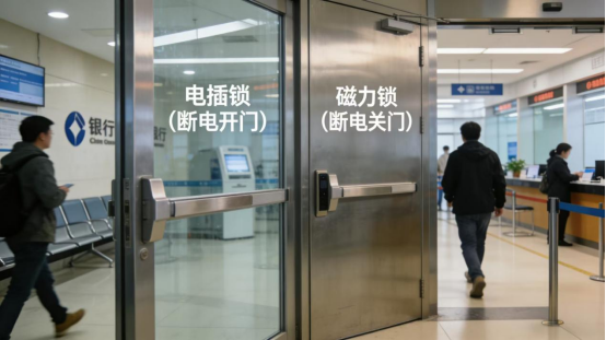 弱电猫 门禁系统的电插锁和磁力锁,在断电时哪个是 “开门” 状态?为什么银行、医院等场所必须选这种类型?