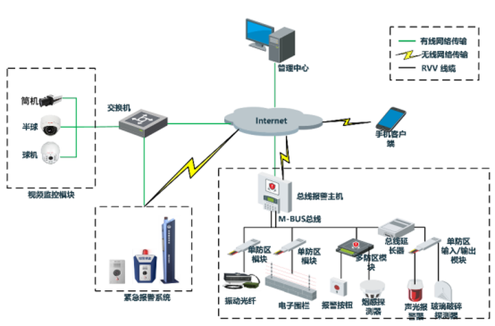 报警系统由前端设备、传输网络和中心管理平台组成。整体的系统架构示意图如下: