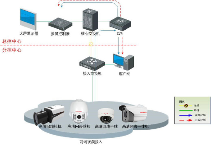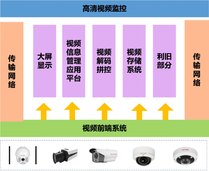 高清视频监控从逻辑上可分为视频前端系统、传输网络、视频存储系统、视频解码拼控、大屏显示、视频信息管理应用平台、利旧等几个部分。