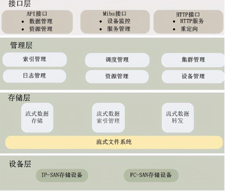 云存储系统采用分层结构设计,整个系统从逻辑上分为四层,分别为设备层、存储层、管理层、接口层。