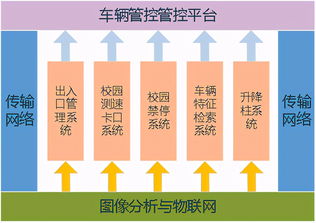 车辆管理方案从逻辑上可分为图像分析和物联网技术、传输网络、出入口控制系统、校园卡口系统、校园违停系统、升降柱系统、车辆管理平台等几个部分,如下图所示。