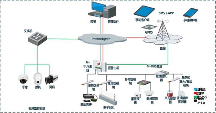 报警系统由前端设备、传输网络和中心管理平台组成。整体的系统架构示意图如下:
